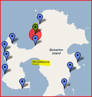 - 594kms east of Darwin on Bickerton Island and 7kms south is Milyakburra