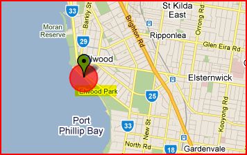 Elwood Beach - 9kms south south east of Melbourne and within 1km is Elwood Park.