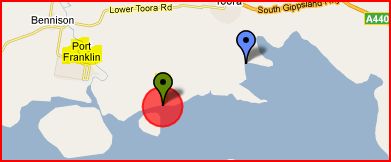 Lawson Beach - 152kms south east of Melbourne and 3kms west north west is Port Franklin.