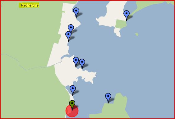 Motts Beach - 85kms south south west of Hobart and 6kms north north is Recherche.
