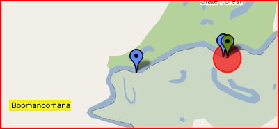 Nevins Beach East - 223kms north north east of Melbourne and 6kms west south west is Boomanoomana.