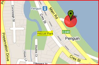 Penguin Beach - 223kms north north west of Hobart and within 1km is Hiscutt Park.
