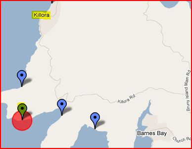 Queens Beach - 27kms south south west of Hobart and 3kms north north east is Killora.