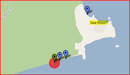 Submarine Beach - 198kms north east of Sydney and 4kms north east is Seal Rocks.