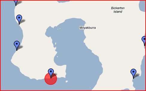 - 594kms east of Darwin on Bickerton Island and 8kms north north east is Milyakburra.